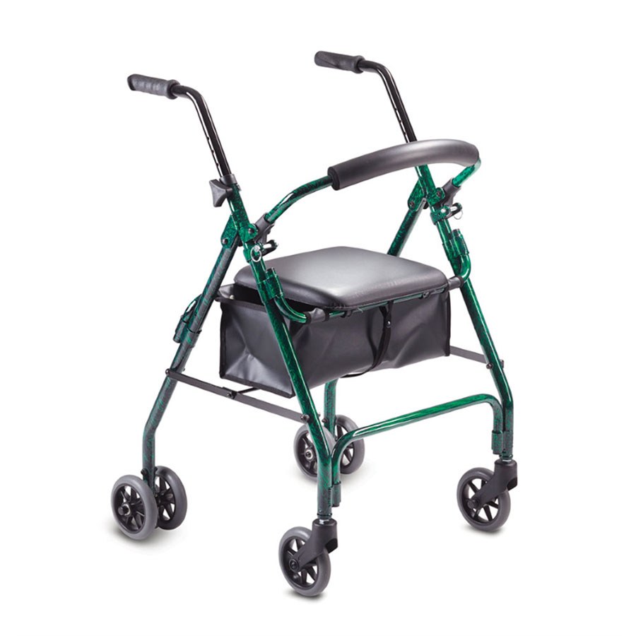 Frame and backrest fold compact for storage and transportation. Height adjustable handles. Push down brake system. Curved padded backrest for additional comfort and support. Supplied with removable backrest, vinyl bag and padded seat. Walker can be folded with vinyl bag still attached.