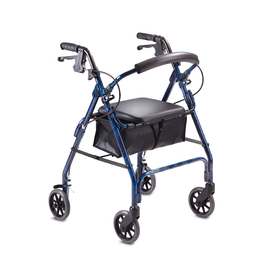 Frame and backrest fold compact for storage and transportation. Height adjustable handles. Handbrakes can be locked for added stability. Curved padded backrest for additional comfort and support. Supplied with removable backrest, vinyl bag and padded seat. Walker can be folded with vinyl bag still attached.